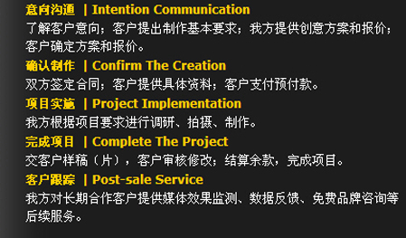 保證力——作業(yè)流程 我們一直相信,只有科學(xué)、規(guī)范的作業(yè)流程作為運(yùn)作保障,優(yōu)秀的創(chuàng)意才能得以完美的實(shí)施。在經(jīng)典影視,我們一直秉承——策略精準(zhǔn) . 創(chuàng)意新銳 . 執(zhí)行出色。